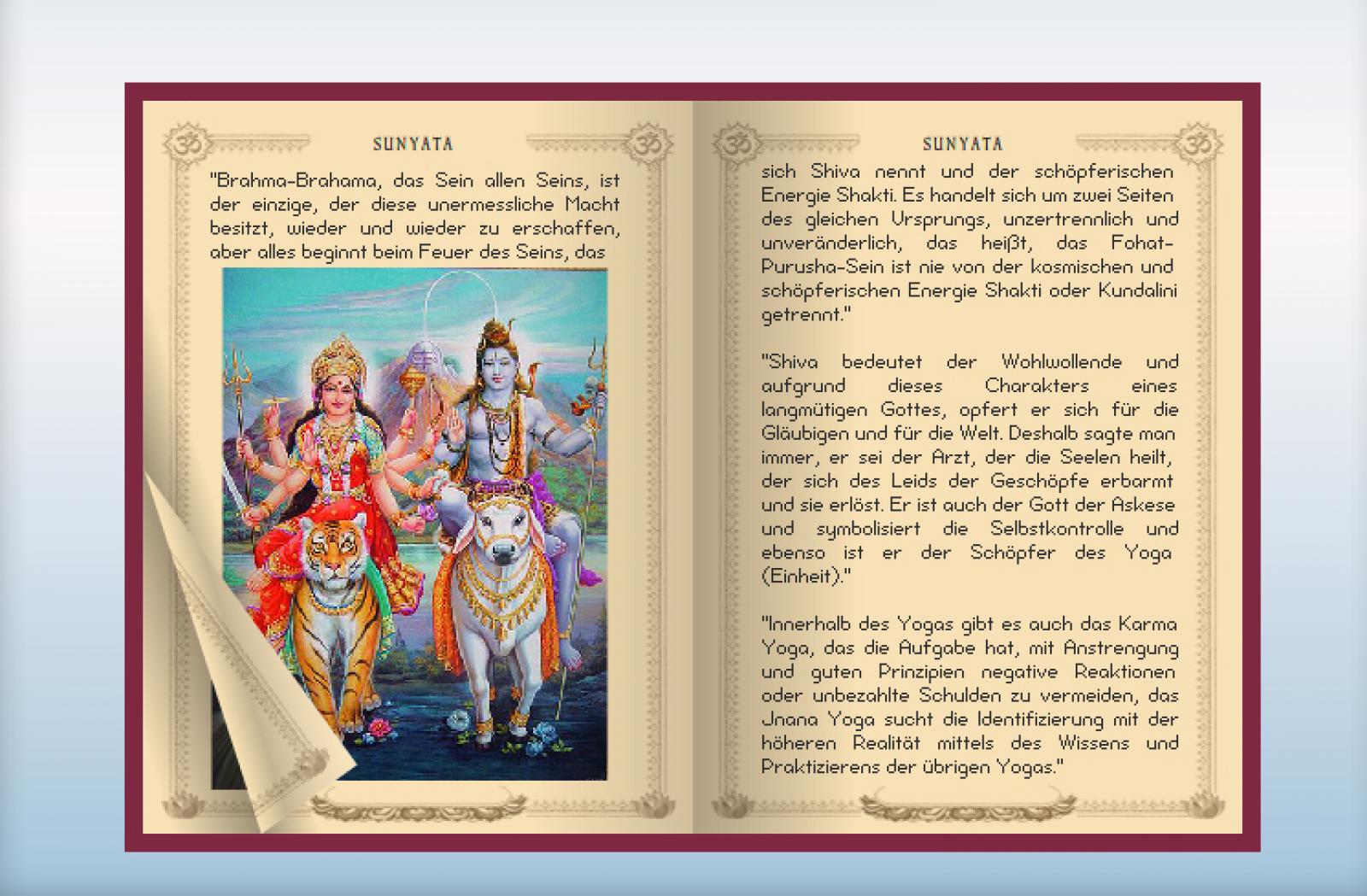 „Shiva bedeutet der Wohlwollende und aufgrund dieses Charakters eines langmütigen Gottes, opfert er sich für die Gläubigen und für die Welt. Deshalb sagte man immer, er sei der Arzt, der die Seelen heilt, der sich des Leids der Geschöpfe erbarmt und sie erlöst. Er ist auch der Gott der Askese und symbolisiert die Selbstkontrolle und ebenso ist er der Schöpfer des Yoga (Einheit).“