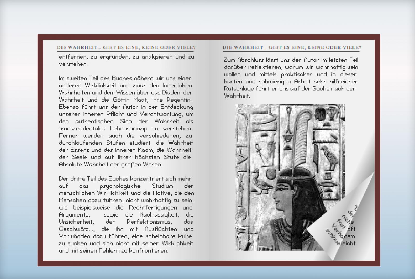"Die Göttin Maat stellt in der ägyptischen Kultur einen Teil der Psychostase post mortem dar, denn sie verkörpert die Wahrheit. Wir könnten sagen, sie ist die objektive Referenz der authentischen Wirklichkeit der Dinge, deshalb bedeutet Maat Wahrheit und es ist wichtig dies zu verstehen."
