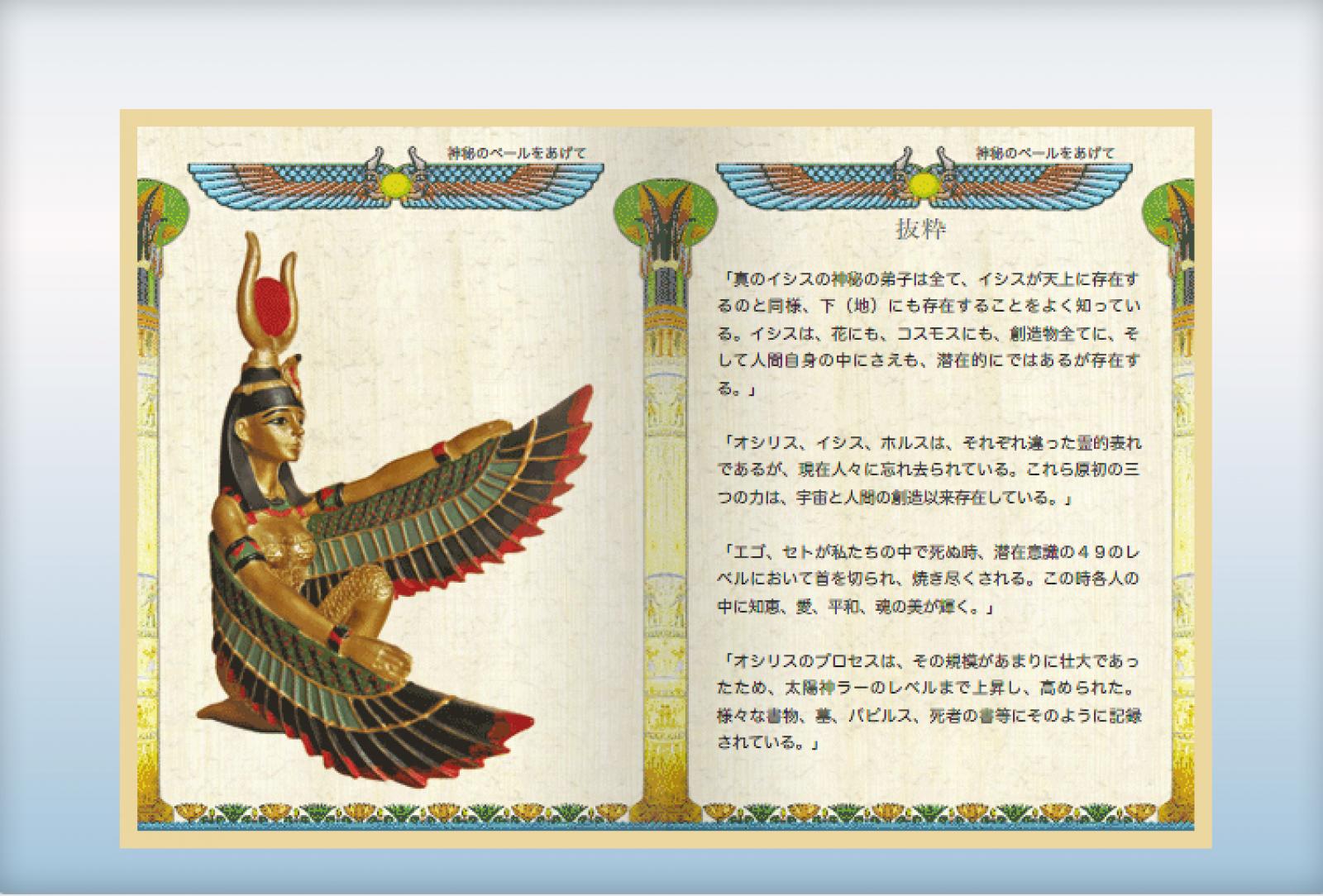 「オシリス、イシス、ホルスは、それぞれ違った霊的表れであるが、現在人々に忘れ去られている。これら原初の三つの力は、宇宙と人間の創造以来存在している。」