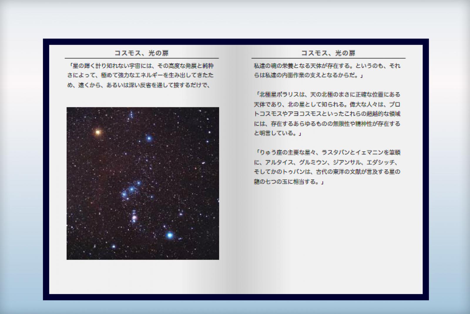 「星の輝く果てしない宇宙には、その高度な発達と純粋さによって非常に強力なエネルギーを作り上げたため、遠くからでもコンタクトするだけで、あるいは深い反省を通して、私たちの魂の栄養となる天体が存在する。それは、内面作業を助けるものである。」