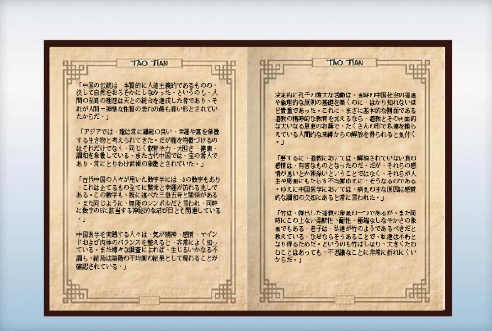 「アジアでは、龍は常に縁起の良い、幸運や富を象徴する生き物と考えられてきた。だが龍を特徴づけるのはそれだけでなく、同じく叡智や力、大胆さ、健康、調和を象徴している。また古代中国では、宝の番人であり、常にとりわけ武術の象徴とされていた。」