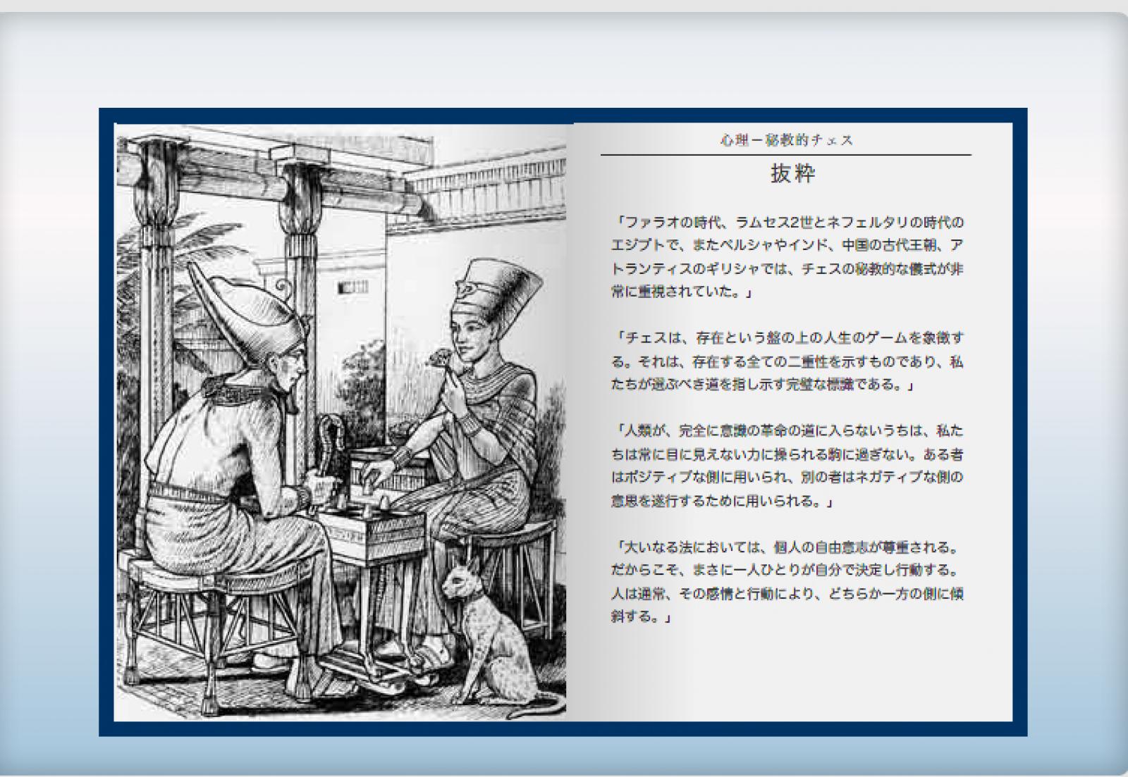 「ファラオの時代、ラムセス2世とネフェルタリの時代のエジプトで、またペルシャやインド、中国の古代王朝、アトランティスのギリシャでは、チェスの秘教的な儀式が非常に重視されていた。」