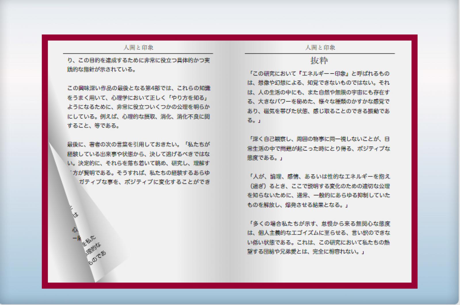 「この研究において『エネルギー-印象』と呼ばれるものは、想像や幻想による、知覚できないものではない。それは、人の生活の中にも、また自然や無限の宇宙にも存在する、大きなパワーを秘めた、様々な種類のかすかな感覚であり、磁気を帯びた状態、感じ取ることのできる振動である。」