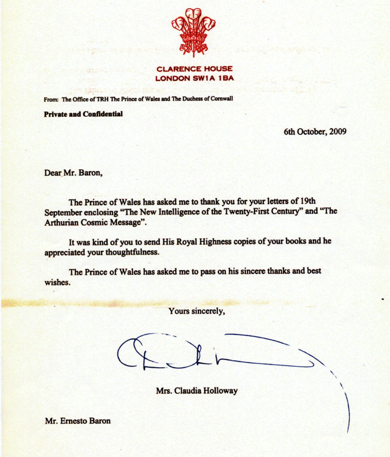 "...O Príncipe de Gales pediu-me para lhe agradecer por suas cartas de 19 de Setembro (2009) e por seus livros "A Nova Inteligência do Século XXI" e "A Mensagem Cósmica Arturiana"..."