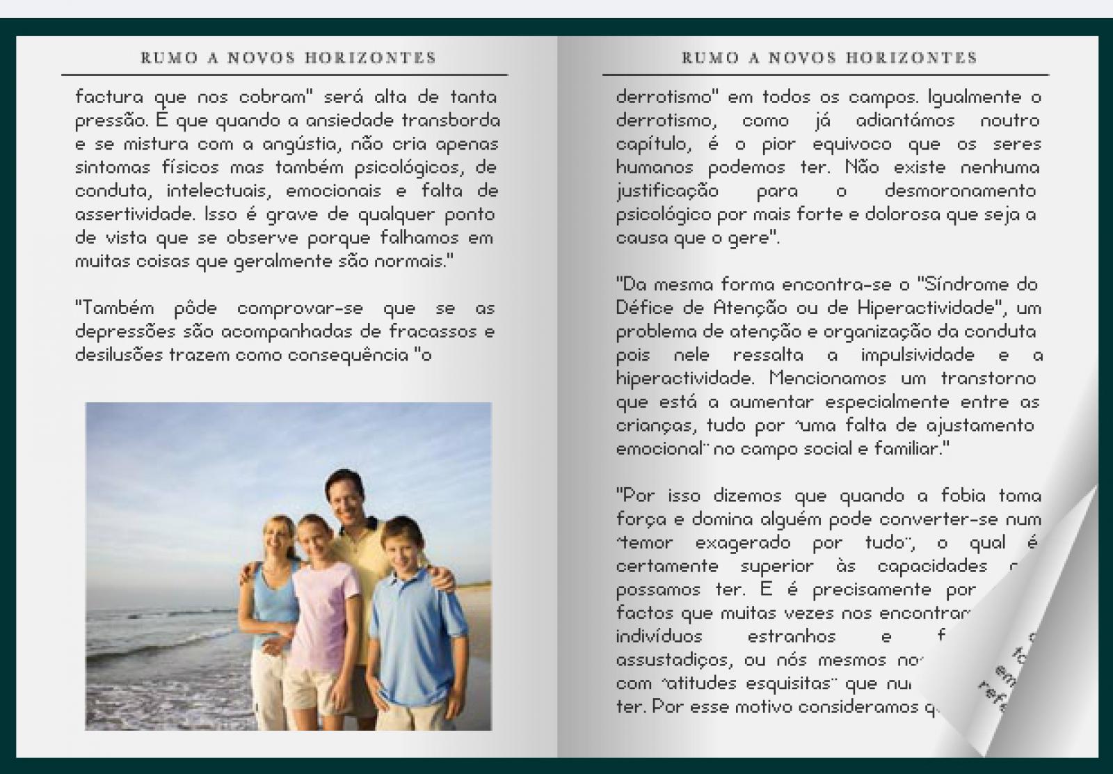 Nós lhes apresentamos alguns extractos do livro "Rumo a Novos Horizontes", obra de psicologia e sociologia de total actualidade, leva-nos a procurar soluções para muitas coisas que estão erradas da nossa vida e a aprofundar as estratégias e capacidades que precisamos desenvolver para nos conduzirmos no dia-a-dia.