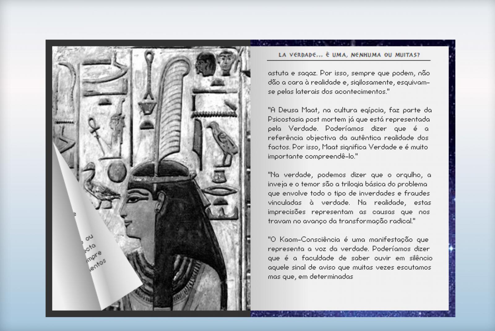 “A Deusa Maat dentro da cultura egípcia, forma parte da Psicostásia post mortem já que está representada pela Verdade. Poderíamos dizer que é a referência objetiva da autêntica realidade dos fatos. Por isso Maat significa Verdade, e isto em si é muito importante compreender.”