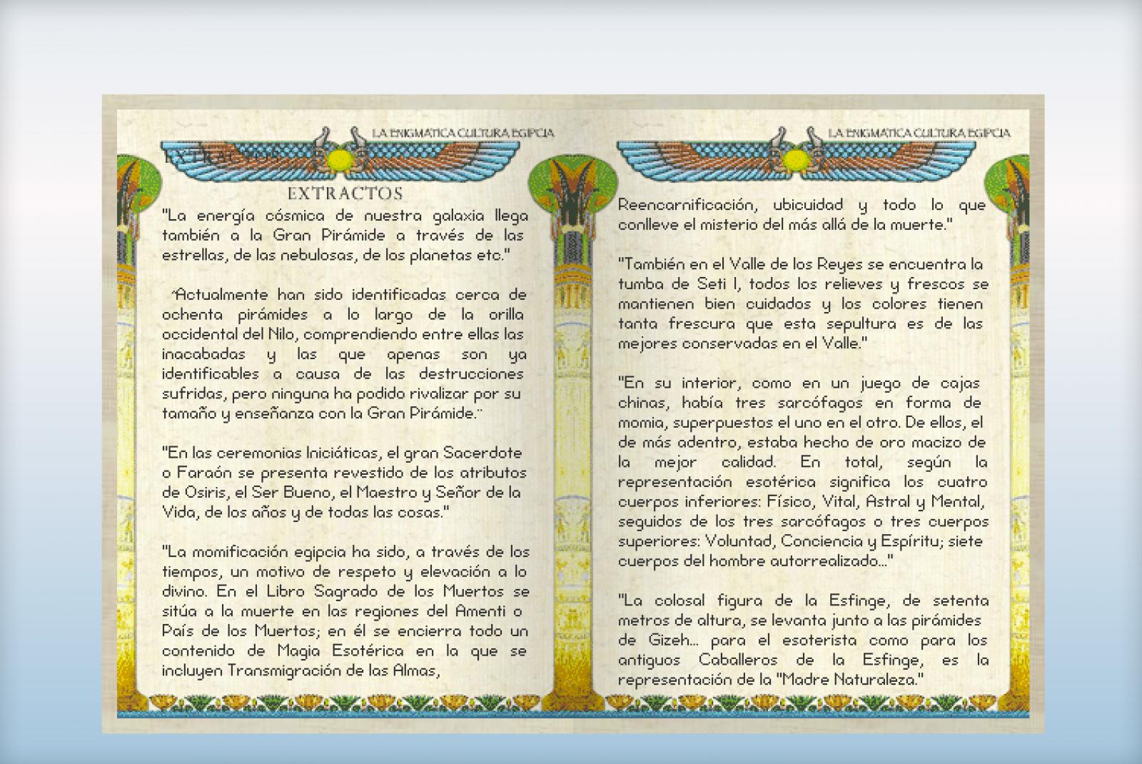 “La momificación egipcia ha sido, a través de los tiempos, un motivo de respeto y elevación a lo divino. En el Libro Sagrado de los Muertos se sitúa a la muerte en las regiones del Amenti o País de los Muertos; en él se encierra todo un contenido de Magia Esotérica en la que se incluyen Transmigración de las Almas, Reencarnificación, ubicuidad y todo lo que conlleve el misterio del más allá de la muerte.”