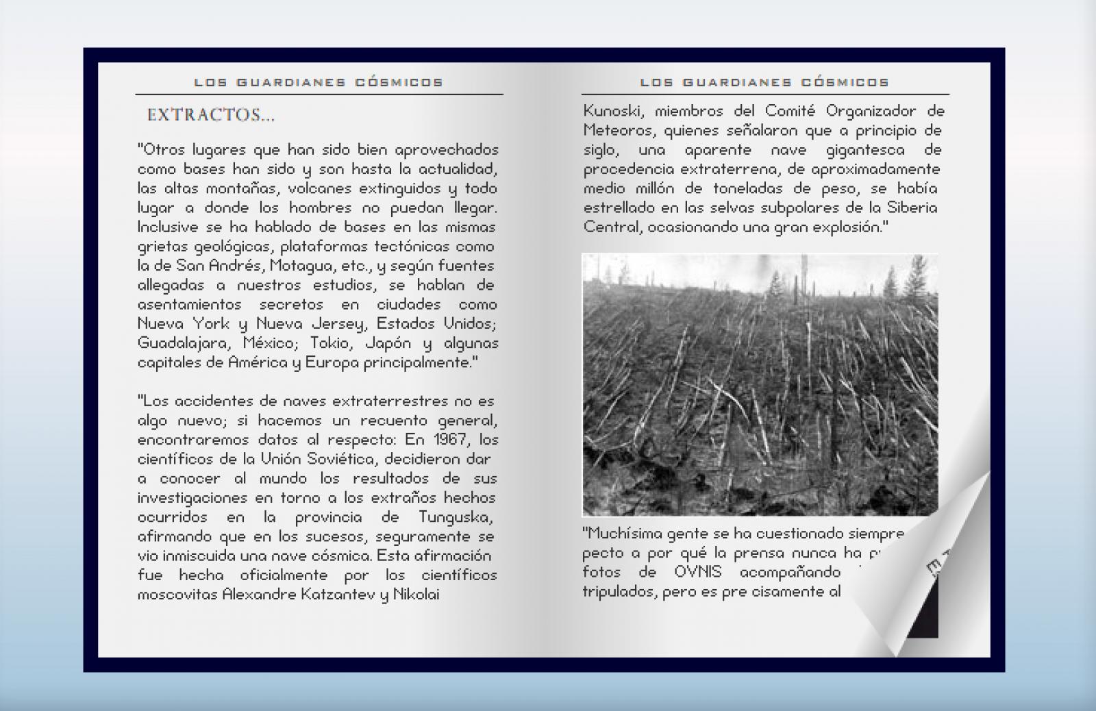 "Los accidentes de naves extraterrestres no son algo nuevo; si hacemos un recuento general, encontraremos datos al respecto: En 1967, los científicos de la Unión Soviética, decidieron dar a conocer al mundo los resultados de sus investigaciones en torno a los extraños hechos ocurridos en la provincia de Tunguska, afirmando que en los sucesos, seguramente se vio inmiscuida una nave cósmica. Esta afirmación fue hecha oficialmente por los científicos moscovitas Alexandre Katzantev y Nikolai Kunoski, miembros del Comité Organizador de Meteoros, quienes señalaron que a principios de siglo, una aparente nave gigantesca de procedencia extraterrena, de aproximadamente medio millón de toneladas de peso, se había estrellado en las selvas subpolares de la Siberia Central, ocasionando una gran explosión."